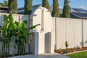 > Architectural landscaping with feature Palm, outdoor brass shower and stone steppers