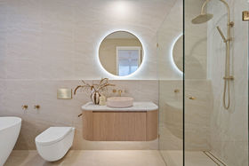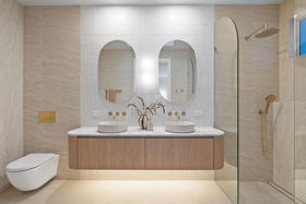 > Wall hung toilets with in-wall brushed brass backing plates - ABI